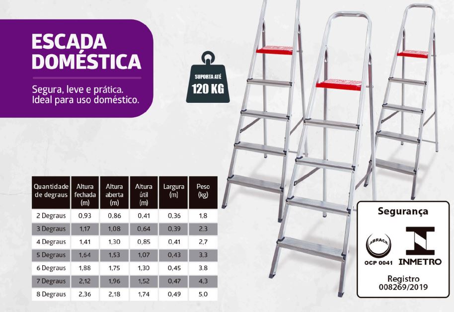 A Escada Doméstica é certificada pelo INMETRO, suporta até 120kg. Leve e resistente, é confeccionada em alumínio e é apropriada para atividades da casa. Com ela você consegue alcançar prateleiras, armários e outros locais mais altos com mais segurança.